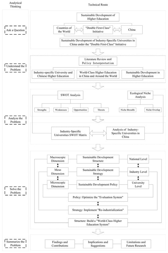 The main research content and technical road of this paper are shown in Figure 1. Part One presents the introduction. Part Two provides an overview of relevant literature and policies concerning industry-specific universities and Chinese higher education, world-class higher education in China and around the world, and sustainable development in higher education. Part Three introduces the SWOT analysis principles and operational procedures. It also establishes a calculation model for the sustainable development of industry-specific universities based on niche theory. Part Four discusses the challenges and opportunities of industry-specific universities under the “Double First-Class” initiative using SWOT analysis. From a niche perspective, it calculates niche breadth and niche overlap. It also conducts comparative analyses of the ecological niches of industry-specific universities at specific time points and carries out trend analyses over time series. The final part summarizes the research findings and proposes measures and recommendations for achieving the sustainable development of industry-specific universities.