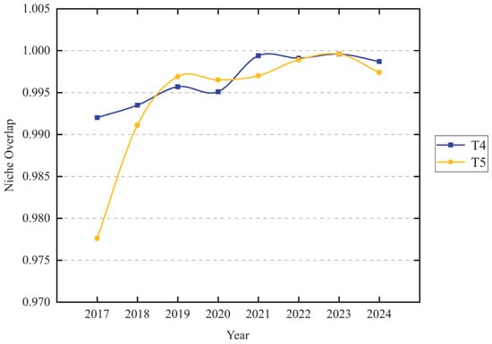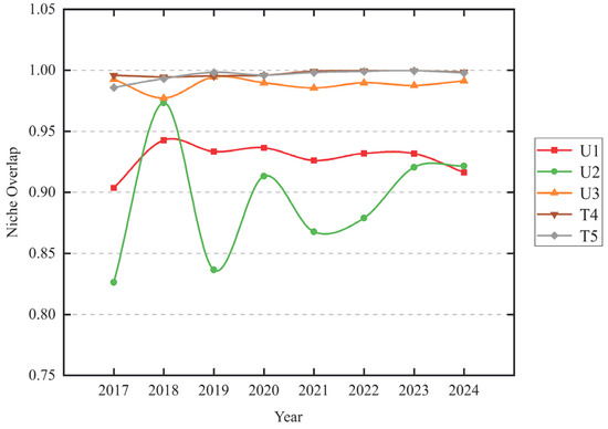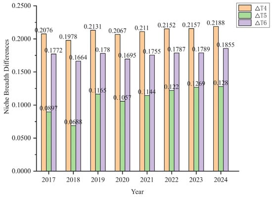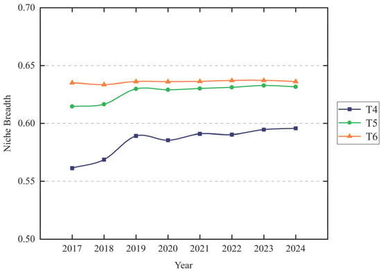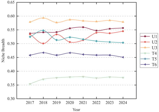 The concept of ecological niche is abstract and ambiguous, requiring specific quantitative indicators for measurement. There are many parameters that can characterize niche features, such as niche situation, niche breadth, niche overlap, and niche differentiation. But the two most commonly used indicators are niche breadth and niche overlap [80]. This paper adopts niche breadth and niche overlap as the measurement indicators.