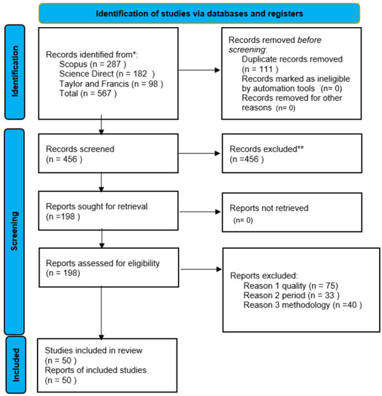 The initial search of three databases yielded 567 potentially relevant records (Scopus: 287; Science Direct: 182; Taylor and Francis: 98). After removing 111 duplicate records, two independent reviewers (EVRF and GLCI) conducted a systematic review of the titles and abstracts of 456 unique records using predefined criteria. The independent reviewers systematically applied the inclusion and exclusion criteria, and consensus was reached through structured discussion protocols. A full-text assessment of 198 preselected articles was conducted, and 148 studies were excluded due to methodological rigor (75), temporal misalignment (33), and inadequate thematic relevance (40). The final synthesis of the evidence incorporated 50 studies that met all eligibility criteria (Figure 1).