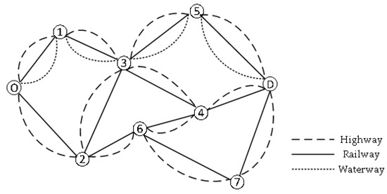The multimodal transportation network is represented by and for the set of nodes (N), the set of arcs (A), and the set of modes of transportation (M). In this expression, , and . Model parameters and symbols are shown in Table 1.