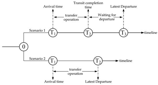 The impact of fixed departure schedules on vehicle transshipment scheduling is illustrated in Figure 2. The figure shows that if the subsequent mode of transport is rail or waterway, the cargo arriving at the transshipment node at time T1 must first undergo necessary transshipment operations. These are completed by time T2. However, due to the fixed departure schedules of rail and waterway transport, the vehicle must wait until the next scheduled departure at time T3 to continue the journey. This results in a waiting time window between T2 and T3. In contrast, if the subsequent mode is road transport, the cargo can depart immediately after completing transshipment at time T2. This avoids a schedule-related delay, as road transport is not constrained by fixed departure times.