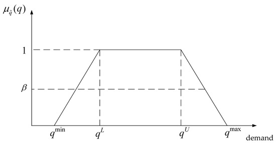 In transportation, demand for cargo may change based on economic fluctuations, seasonal demand fluctuations, sudden replenishment, and human subjective factors. Therefore, the specific demand for cargo is often uncertain when preparing the transportation plan. Despite this, the cargo carrier can reasonably estimate the approximate range of fluctuations based on historical order data and experience. To address the uncertainty in freight demand, this study adopts a fuzzy programming approach. Previous studies commonly used triangular fuzzy numbers and trapezoidal fuzzy numbers to represent uncertain demand [27]. However, the maximum membership degree of a triangular fuzzy number corresponds to a single point, making it suitable only for well-defined values. In contrast, trapezoidal fuzzy numbers provide greater flexibility, as their maximum membership degree corresponds to an interval. This allows decision-makers to hold differing views on the most likely value. Using trapezoidal fuzzy numbers to represent fuzzy demand is more consistent with real-world conditions. Therefore, this study uses trapezoidal fuzzy numbers to represent the demand as ; this is shown in Figure 3. Here, represents the membership function, and denotes the preferred value of the fuzzy demand. Different decision-makers can hold different opinions on the most likely demand interval by adjusting the preference value . The result is the most pessimistic estimate, which is unlikely to occur in practice; denotes the upper and lower limits of the most probable demand; and is the most optimistic estimate, which is less likely to occur. These four values are usually determined based on historical transportation data and experience. The affiliation function of fuzzy demand is shown in Equation (1).