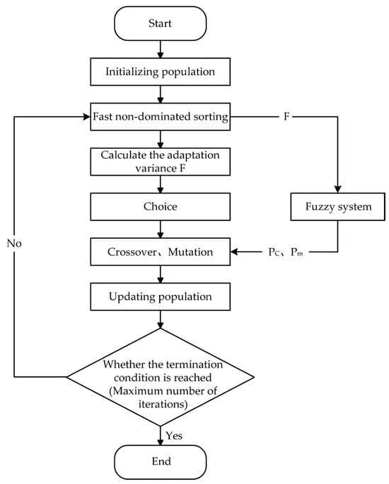 The traditional NSGA-II algorithm is commonly used to solve multi-objective optimization problems [29,30]. However, it tends to get stuck within a local optima when using fixed crossover probability Pc and mutation probability Pm. This makes it difficult for the algorithm to search for the globally optimal solution. Therefore, this paper integrates the diversity characteristics of Pareto front non-dominated solutions generated by a bi-objective optimization problem to design an improved fuzzy adaptive non-dominated sorting genetic algorithm based on NSGA-II. The improved algorithm based on fuzzy logic adjusts the Pc and Pm by defining rules within the fuzzy system. The fuzzy system is then integrated into the NSGA-II algorithm as a mechanism to dynamically adjust the Pc and Pm in real time. This optimizes algorithm performance.