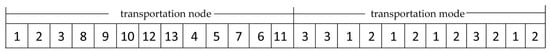 This study uses a two-stage coding method, with a coding length of 2N-1. There are N nodes in the transportation network. Figure 5 shows that for a multimodal transport network with 13 nodes, the corresponding transportation path is 1-2-3-8-9-10-12-13. The transportation modes are waterway–waterway–highway–railway–highway–railway–highway.