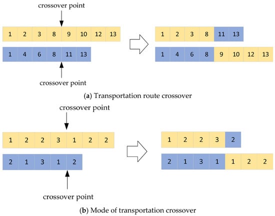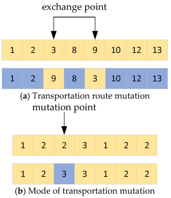 Based on the adaptively adjusted and , crossover and mutation operations are applied to individuals in the population to generate new individuals. The crossover operation adopts an improved single-point crossover method, as shown in Figure 6. For the transportation route, identical nodes are selected for crossover, excluding the starting and ending points. If multiple common nodes exist, one is randomly selected as the crossover point. For the transportation mode, the crossover is conducted at the corresponding position based on the selected crossover point in the route. The mutation operation is shown in Figure 7. In the transportation route section, the positions of two nodes are randomly swapped, excluding the starting and ending points. In the transportation mode section, the transportation mode of a route segment is randomly modified.
