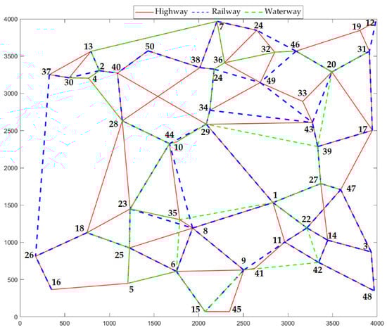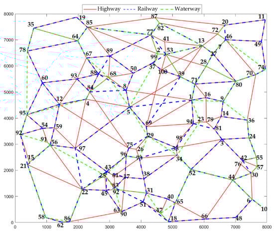 Four random test cases with different scales (10, 30, 50, and 100 nodes) are designed to validate the effectiveness of the proposed algorithm. These involved three modes of transportation: highway, railway, and waterway. In the plane coordinate system, the random test cases were generated using specific rules. The representative network diagrams of randomized arithmetic cases are shown in Figure 8 and Figure 9. The transportation and transshipment data for the highway–railway–waterway route are shown in Table 3 and Table 4 for the eastern region.