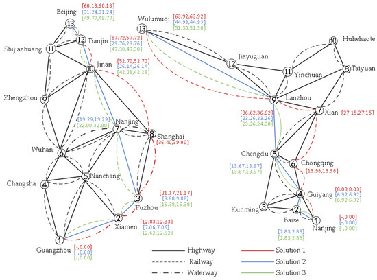 Figure 10 shows that in the eastern region, Solution 1 involves a water-to-rail transshipment at node 8. Due to the fixed departure schedules of rail transport, this results in a total of 2.6 h of transshipment and waiting time; of this total, 1.88 h is waiting time. Solutions 2 and 3 do not involve any transshipment, and do not incur waiting time. In the western region, neither Solutions 1 nor 2 involve transshipment, so there is no waiting time. However, Solution 3 involves a road-to-rail transshipment at node 9, resulting in a total of 0.74 h of transshipment and waiting time; of this total, waiting time accounts for 0.02 h.