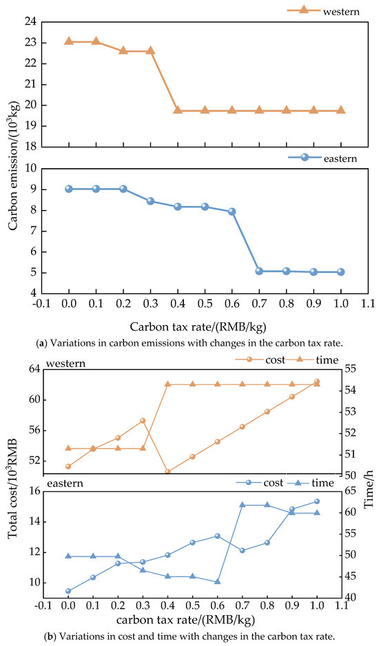 The carbon tax rate affects the selection of transportation routes and modes, impacting total transportation cost, time, and carbon emissions. Carbon tax rates significantly vary across countries. Poland has the lowest carbon tax rate at USD 0.08/t; Sweden has the highest rate at USD 137.24/t [35]. This range is used to evaluate the effects of changes in the carbon tax rate on carbon emissions, costs, and time. To eliminate potential bias with respect to cost and time, the optimal solution based on the entropy weight-TOPSIS method is selected for the carbon tax impact analysis. This study analyzes the impact of the carbon tax rate by comparing the more developed eastern region and the less developed western region of the multimodal transportation network. The results are shown in Figure 11 and Table 8 and Table 9.