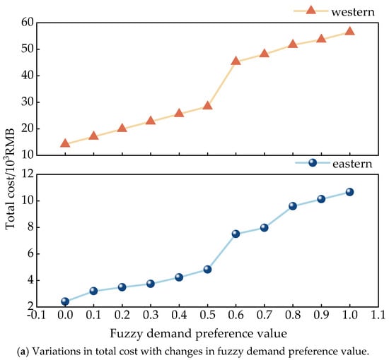 The size of the fuzzy demand preference value reflects the customer’s preference for transportation reliability. To analyze the impact of the fuzzy demand preference value on total transportation cost and carbon emissions, the study includes a sensitivity analysis of this value. The selected solution is the optimal solution based on the entropy weight-TOPSIS ranking method. The results are shown in Figure 12.