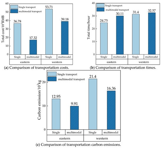 Figure 13 shows that multimodal transportation is significantly more cost-effective than single-mode transportation. This reflects its advantages with respect to economic efficiency. Specifically, in the eastern region, the total transportation cost of multimodal transportation is 52.91% lower than that of single-mode transportation. In the western region, the decrease is 27.05%. This difference is mainly due to the more developed multimodal network in the eastern region; this provides more convenient conditions for multimodal transport. In regions with more advanced transportation networks, multimodal transportation offers greater economic advantages. Additionally, by incorporating railway and waterway transportation modes, multimodal transportation effectively reduces carbon emissions. However, since multimodal transport involves integration and transfer between different modes of transportation, single-mode transport has a slight advantage in terms of transportation efficiency. As such, cargo carriers should select the transportation mode based on timeliness requirements. For cargo deliveries that are less urgent, multimodal transport can be an effective choice for reducing logistics costs and achieving green transportation.