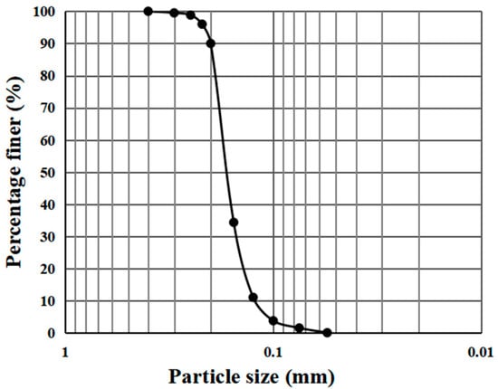 The sand was sourced from the Tengger Desert (104°17′ E, 36°59′ N) in Ningxia, China. Using the sieving method, the particle size distribution of the sand was obtained, as illustrated in Figure 1. The D10, D30, and D60 of the sand values are 0.11 mm, 0.146 mm, and 0.19 mm, respectively. Calculated from D10, D30 and D60, Cu = 1.73 and Cc = 1.02. Based on these values, the sand is classified as poorly graded sand (SP) according to the Unified Soil Classification System (ASTM D2487-06) [31]. The moisture content, specific gravity (Gs), and dry density of the sand are 0.31, 2.66, and 1.46 g·cm−3. X-ray diffraction (XRD) analysis was conducted on the sand, indicating that its main composition is quartz [32].