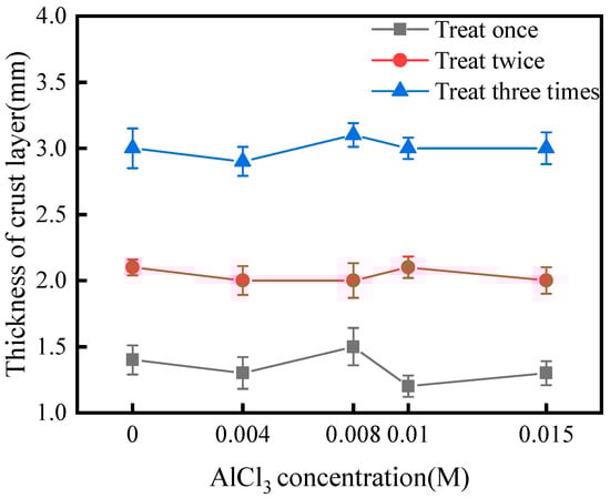 As shown in Figure 2, the AlCl3 additive had little effect on the viscosity of the treatment solution. This suggested that the AlCl3 additive did not reduce the permeability of the solution in the sand. As shown in Figure 3, after one, two, and three treatments, the thickness of the crust layer was approximately 1.3, 2.0, and 3.0 cm, respectively, with or without the AlCl3 additive. This suggested that the AlCl3 additive did not change the viscosity of the treatment solution or reduce the thickness of the crust layer.