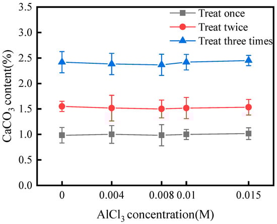 Figure 4 shows that the CaCO3 content of the crust layer was almost independent of the concentration of AlCl3 additive after treatment with SICP and AlCl3 additive. After one, two, and three treatments, the CaCO3 content of the crust layer was approximately 1.0%, 1.5%, and 2.5%, respectively. The results are in agreement with Meng et al. [37]. Thus, it can be concluded that the AlCl3 additive did not inhibit urease-induced CaCO3 precipitation within the concentration range studied.
