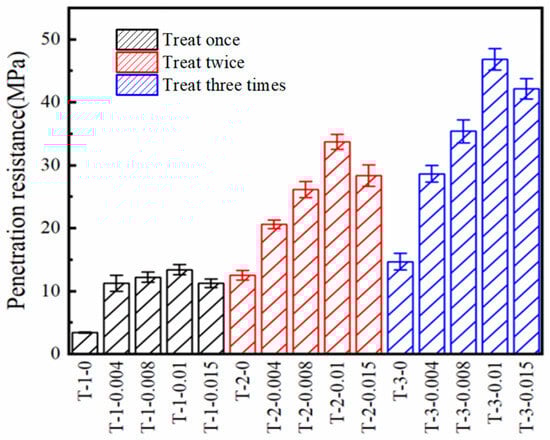 Comparing the penetration resistance of the SICP with AlCl3 additive-treated and SICP-treated specimens, the AlCl3 additive resulted in a significant increase in the penetration resistance of the specimens. For instance, after one treatment, the penetration resistance of the T-1-0 specimen was 3.45 MPa, and that of the T-1-0.01 specimen was 13.42 MPa, an increase of 289%. In previous studies, a penetration resistance of 13.42 MPa was not achieved at the 1% CaCO3 content (Figure 6) [17,38,41]. After two treatments, the penetration resistance of the T-2-0 was 12.52 MPa, and that of the T-2-0.01 specimen was 33.68 MPa, an increase of 169%. After three treatments, the penetration resistance of the T-3-0 specimen was 14.69 MPa, and that of the T-3-0.01 specimen was 46.84 MPa, an increase of 219%. It can be concluded that the maximum number of treatments for this desert sand was three, and the ultimate penetration resistances of the SICP-treated and SICP with AlCl3 additive-treated specimens were 14.69 and 46.84 MPa, respectively. This indicated that the AlCl3 additive resulted in a 219% increase in the ultimate penetration resistance of the SICP-treated specimen.