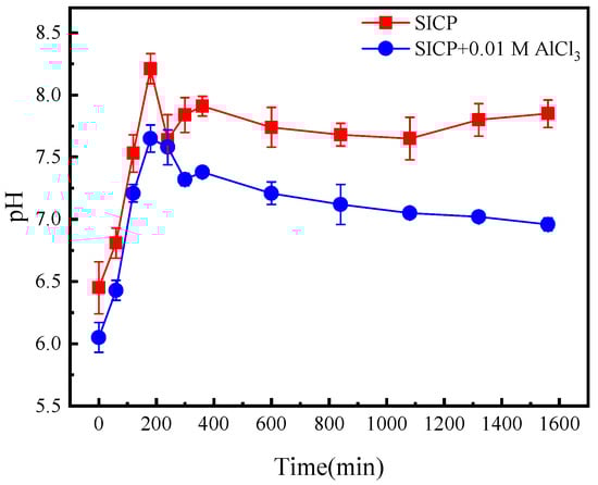 Figure 10 presents the temporal changes in soil pH. The pH of the SICP and SICP with AlCl3-treated soils exhibited a peak around 4 h of reaction, followed by a gradual decrease. The final pH of the SICP-treated soil was weakly basic, approximately 7.8. In contrast, the pH of the SICP with AlCl3-treated soil eventually reached a neutral level of around 7. Therefore, it can be concluded that the soil does not experience acidification at this aluminum ion content. Despite observing a higher concentration of residual aluminum ions in the surface crust layer compared to the subsoil, this method remains highly promising. This is because it enhances soil strength by 3.89 times and reduces the cost of wind and sand control by half, in comparison to conventional approaches. Consequently, the aforementioned benefits render this method economically and environmentally appealing.