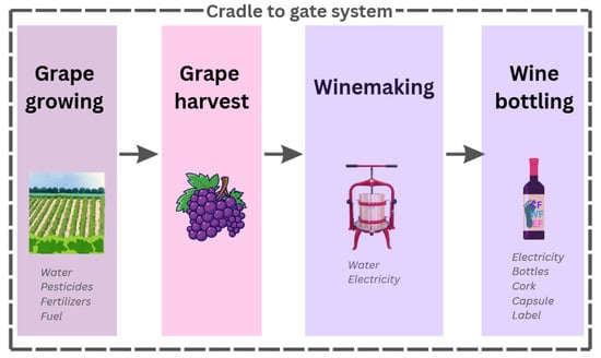 Based on the results of the literature review (Section 1), this study adopted a 0.75 L wine bottle as FU and “cradle to gate” system boundaries (Figure 2).