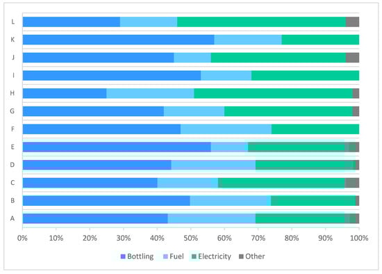 Among the case studies, the largest Carbon Footprint value associated with bottling and electricity consumption during vinification are related to Cases E, I, and K. The Carbon Footprint values associated with fuel used during viticulture are related to Cases A, B, F and H, probably because the used farm equipment is most likely older and requires more energy. Literature reports highly variable data on the contributions to the Carbon Footprint of a 0.75 L bottle of red wine: packaging (18–25% of the total Carbon Footprint) [45,46], viticulture (15–50%) [17,27,45,46], and vinification (25–85%) [17,43,46], with detailed data about the contributions to the Carbon Footprint of agricultural fuel (8–19%) and of the chemicals applied in viticulture and vinification (4%) [16,33,45]. The only Carbon Footprint value obtained in this study that is higher than literature data is related to the glass bottle. This may be due to the type of bottle used by the considered producers, which is commonly associated in Italy with high-wine quality.