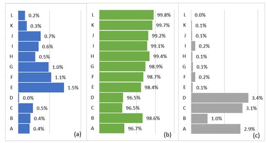 Contributions to the Water Footprint (WF) of the 12 case studies: (a) Blue WF, (b) Green WF and (c) Grey WF.