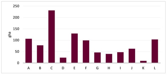 The average EF was 81.3 ± 59.2 gha, with a range spanning from 9.46 to 231.2 gha (Figure 5). These results cannot be compared with literature data, as they are previously unknown. The average, 73 ± 3%, of the EF can be ascribed to the land assigned to the vineyard, while the 27 ± 3% to the area necessary for the assimilation of CO2 emissions. The minimum EF values calculated for Cases D and K are related with the small area of cultivated land, respectively, 5 and 2 hectares.