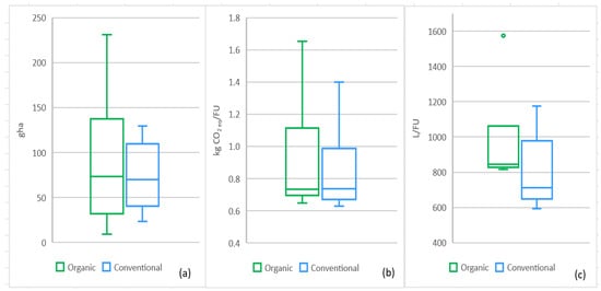Overall trend of (a) Ecological Footprint (EF), (b) Carbon Footprint (CF), and (c) Water Footprint (WF) within the 12 case studies comparing organic and conventional agricultural practices.