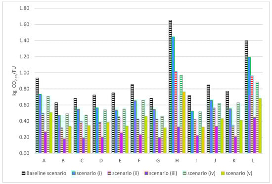 Overall trend of different scenarios assumed for all case studies of the analysis: baseline scenario: calculation of the CF of this study; (i) the same production process of this study located in France; (ii) process located in Italy using recycled glass and electric tractor for agricultural practices, (iii) Process located in France using recycled glass and electric tractor for agricultural practices; (iv) use of recycled glass for the production of the glass bottle; (v) process using recycled glass with the process in France.
