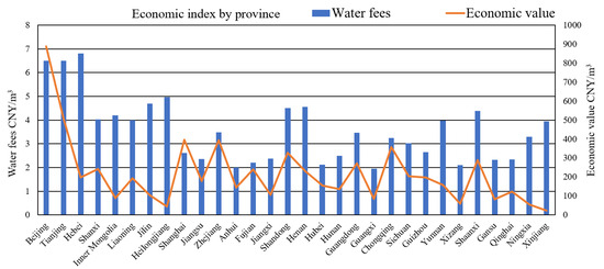As shown in Figure 3, the economic index across the provinces, including water fees and the economic value per unit of water usage, demonstrate significant regional disparities, driven by resource availability, industrial structure, and economic development levels. Provinces with high water fees and high economic value, such as Beijing (6.5 CNY/m3, 889.23 CNY/m3) and Tianjin (6.5 CNY/m3, 506.61 CNY/m3), indicate efficient water use in high-value industries, particularly in the service and technology sectors. Conversely, agriculture-dominated provinces like Xinjiang (3.95 CNY/m3, 24.19 CNY/m3) and Heilongjiang (4.96 CNY/m3, 43.61 CNY/m3) exhibit low economic output per unit of water, reflecting water-intensive, low-productivity sectors. Provinces with low water fees and moderate economic value, such as Hubei (2.12 CNY/m3, 155.77 CNY/m3) and Guangxi (1.95 CNY/m3, 84.86 CNY/m3), benefit from greater water availability. Industrialized coastal regions, including Shanghai (2.62 CNY/m3, 396.93 CNY/m3) and Zhejiang (3.49 CNY/m3, 394.22 CNY/m3), maintain relatively low water costs, while achieving high economic returns, emphasizing their advanced economic structure.