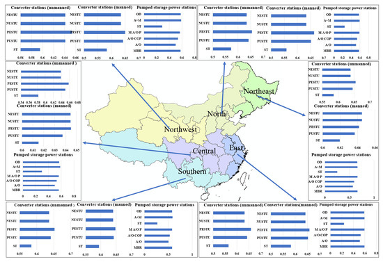 As shown in Figure 6, for pimped storage power stations, the AAO+MBR scores were the highest in the northwest (0.588), southern (0.588), north (0.595), and central (0.583) region, suggesting these types of power stations are best suited for the region’s semi-arid climate and stricter reuse demands. The Multi-stage A/O led in regard to scores in the east (0.596) and northeast (0.665), reflecting the region’s strong industrial base and advanced infrastructure, supporting higher-end technologies. Across all the regions, the Septic Tank method consistently had the lowest scores, confirming its unsuitability for modern, large-scale treatment scenarios.