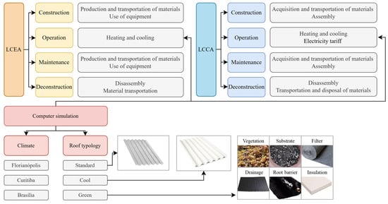 Computer simulations were carried out on a multifamily residential building model to investigate the energy performance of green and cool roofs compared to standard roofs, with and without thermal insulation, in three Brazilian climates. These results and data from the literature were used to estimate the energy consumption and cost over the life cycle of these roofs. Figure 1 shows the main steps of the methodology.