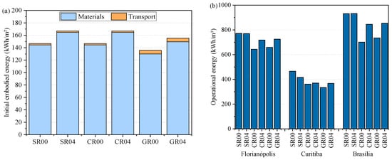 The operational energy varied substantially according to roof typology and climate. The standard roof without insulation in all three cities resulted in the highest energy consumption. With the standard roof, insulation reduced energy use in Curitiba but showed negligible effects in Florianópolis and Brasília. Cool roofs achieved the greatest reductions in operational energy in warmer climates (Florianópolis and Brasília), while green roofs were most effective in Curitiba, a colder city. These findings are consistent with previous studies [37,38,39,40] indicating that cool roofs usually provide superior cooling performance compared to green roofs. However, the high reflectance can increase heating loads during colder periods, reducing solar heat gains.