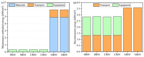 (a) Initial embodied energy, (b) operational energy, (c) maintenance-embodied energy, and (d) deconstruction energy of standard, cool, and green roofs. Abbreviations: standard roof without insulation (SR00), standard roof with insulation (SR04), cool roof without insulation (CR00), cool roof with insulation (CR04), green roof without insulation (GR00), and green roof with insulation (GR04). Note: In the green roofs, the feedstock energy of the organic compound (5.28 kWh/kg [35]) was not included. The equipment accounts for less than 0.05 kWh/m2 of the initial embodied energy.