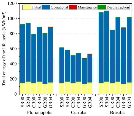 Total energy consumed in the life cycle of standard, cool, and green roofs in Florianópolis, Curitiba, and Brasília (40-year analysis period). Abbreviations: standard roof without insulation (SR00), standard roof with insulation (SR04), cool roof without insulation (CR00), cool roof with insulation (CR04), green roof without insulation (GR00), and green roof with insulation (GR04).
