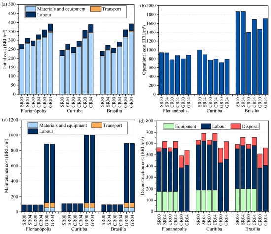 (a) Initial, (b) operational, (c) maintenance, and (d) deconstruction cost of standard, cool, and green roofs. Abbreviations: standard roof without insulation (SR00), standard roof with insulation (SR04), cool roof without insulation (CR00), cool roof with insulation (CR04), green roof without insulation (GR00), and green roof with insulation (GR04).