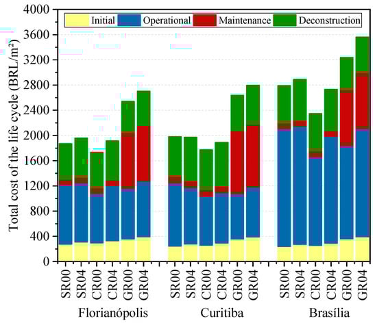 Total life cycle cost of standard, cool, and green roofs in Florianópolis, Curitiba, and Brasília (40-year analysis period). Abbreviations: standard roof without insulation (SR00), standard roof with insulation (SR04), cool roof without insulation (CR00), cool roof with insulation (CR04), green roof without insulation (GR00), and green roof with insulation (GR04).