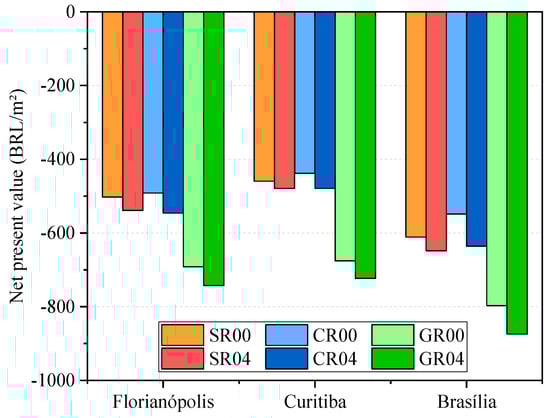 Net present value of standard, cool, and green roofs by floor-plan area in Florianópolis, Curitiba, and Brasília at the end of the analysis period (40 years). Abbreviations: standard roof without insulation (SR00), standard roof with insulation (SR04), cool roof without insulation (CR00), cool roof with insulation (CR04), green roof without insulation (GR00), and green roof with insulation (GR04).