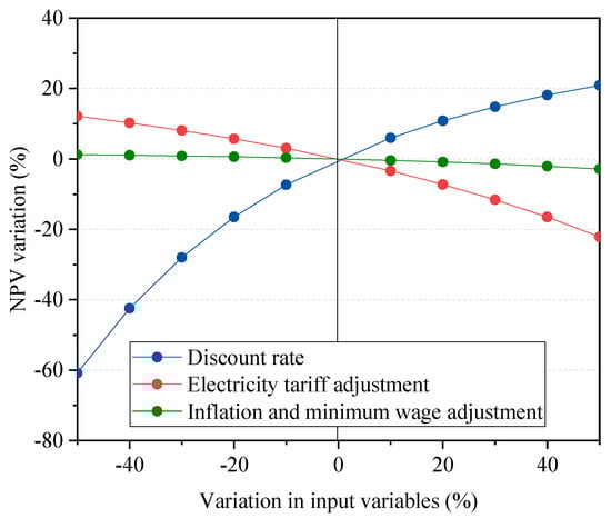 Figure 7 shows the effects of variations in the discount rate, electricity tariff adjustments, inflation, and minimum wage adjustments on the NPV of standard roofs without insulation in Florianópolis, as similar sensitivity patterns were observed across all the typologies and cities. A full summary is available in Table S3 in the Supplementary Materials.