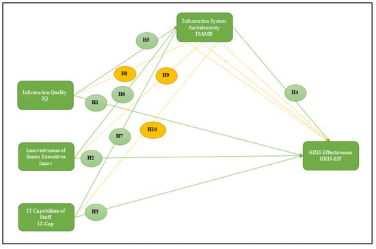 IS ambidexterity is an important dimension of the broader ambidexterity concept, referring to the ability of information systems departments to simultaneously pursue both exploitative and explorative activities [53]. Ref. [85] identified ambidexterity as a key determining factor of innovation. Ref. [53] also found that IS ambidexterity is significantly associated with IS alignment in terms of support for ongoing operations. Similarly, ref. [101,102] reported a positive and significant relationship between ambidexterity and organizational agility. In the context of British high-tech firms, ref. [103] observed that the IT ambidexterity capability relation with IT success is found to be positive and significant. IS ambidexterity reflects a dynamic capability under the theoretical lens of DCT that allows organizations to balance system exploitation and exploration, driving HRIS adaptability and long-term effectiveness. Based on this body of research, the following hypothesis is proposed: