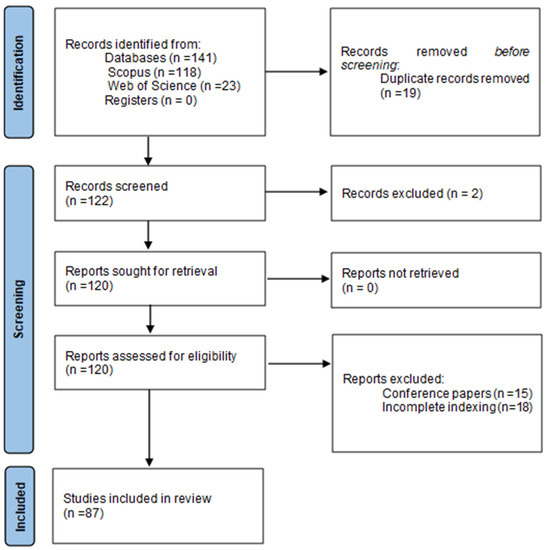 The selection of studies followed a structured process based on the PRISMA flowchart (Figure 1). Initially, documents were identified by employing the search equation utilized in Scopus and Web of Science. Duplicate records and documents containing indexing errors were then removed in order to avoid inconsistencies in the data collection process.