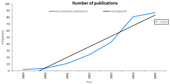 The data corresponding to the year 2025 were collected up to 15 May 2025, based on the availability of indexed publications in Scopus and Web of Science at the time of data retrieval. In order to ensure a valid comparison with full-year data from previous years, the number of publications in 2025 was normalized using a linear projection, under the assumption of a constant publication rate throughout the year. This adjustment enables an equitable comparison of trends in Figure 1, thereby avoiding the underrepresentation of 2025 due to partial-year data. All information related to the included studies and the selection process is available in the Supplementary Material.