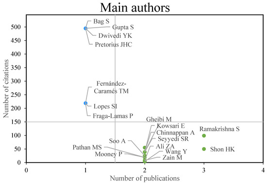 The second group, represented in blue, comprises authors with a limited number of publications but a high number of citations in comparison to the average. This category comprises Bag S, Gupta S, Dwivedi YK, Pretorius JHC, Lopes SI, Fernández-Caramés TM, and Fraga-Lamas P. The third group, represented in green, includes researchers who demonstrate high academic productivity yet receive a low number of citations. The group under discussion includes Seyyedi SR, Gheibi M, Kowsari E, Chinnapan A, Pathan MS, Ali ZA, Zain M, Wang Y, Mooney P, Soo A, Ramakrishna S, and Shon HK.