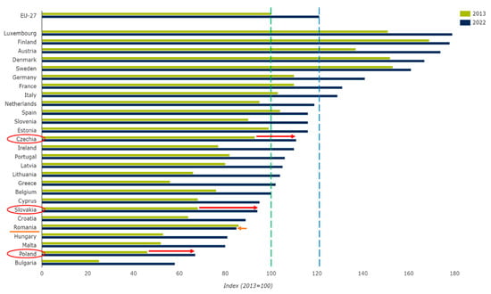 It should be mentioned that eco-innovation refers to various innovations that reduce the impact on the environment or use natural resources more effectively. They are essential to achieving the goals of the European Green Deal and the transition to a climate-neutral and circular economy. Looking more broadly at the time range (comparing 2013 and 2022, Figure 5) and based on the above analysis results and the statistical comparison of eco-innovation in the analyzed countries, it should also be noted that all analyzed countries have done a good job in recent years and have recorded significant improvements in resource efficiency and environmental and climate-related initiatives.