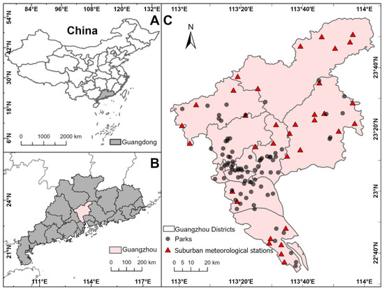 Study area and park locations. (A) This study was conducted in Guangzhou, China. (B) Guangzhou is the capital city of Guangdong Province, dominated by a marine subtropical monsoon climate. (C) The suburban air temperature is determined by the average air temperature of the 34 suburban meteorological stations. There were 84 parks included in analysis for the years from 2014 to 2022.