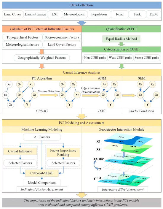 This study integrates SHAP, causal inference, and Geodetector interaction analysis to establish a multidimensional PCI attribution framework. SHAP evaluates the relative contribution of individual predictors to model outputs. Causal inference identifies direct and indirect roles of variables within systemic pathways. The Geodetector interaction module quantifies nonlinear synergies between paired factors. The combined application of these approaches reveals gradient-specific mechanisms underlying PCI dynamics, informing context-adaptive urban cooling strategies.