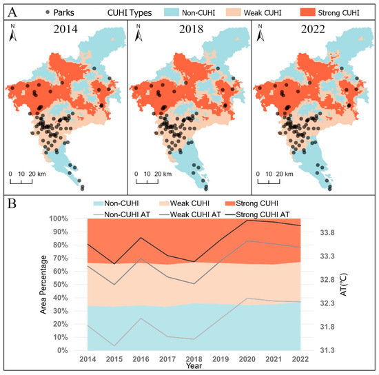 Categorization of CUHI. (A) Parks in each CUHI gradient across years are gathered for modeling PCI. (B) The proportion distribution of different CUHI gradients is relatively consistent across years, whereas the variances in the average air temperature at different CUHI gradients across years are evident.