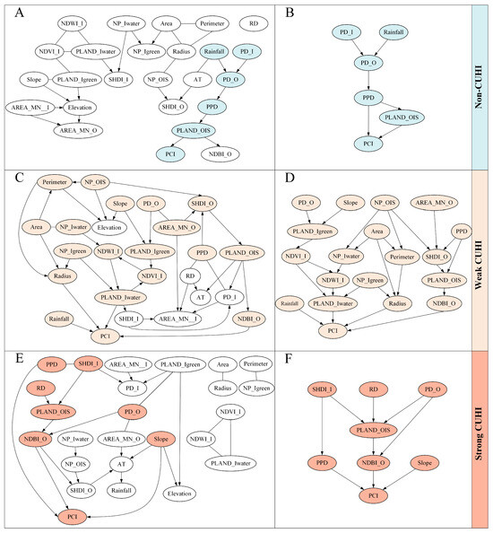 Causal inference analyses of PCI and potential influential factors within the non-CUHI (A,B), the weak CUHI (C,D), and the strong CUHI (E,F). The PC algorithm was employed across all variables (A,C,E). The direct and indirect causal factors related to PCI were selected and re-analyzed to refine the causal inference models (B,D,F). The undirected edges were oriented using ANM, and their statistical significance was rigorously evaluated via SEM, yielding a DAG with definitive causal pathways.