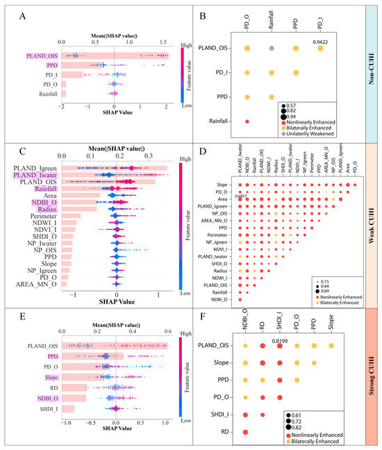 The importance of the interactive effects between factors on PCI was assessed by the interaction module of Geodetector (Figure 5B,D,F). Within the non-CUHI gradient, the interaction between PLAND_OIS and PD_I is the most significant interactive factor influencing PCI, with a bilaterally enhancing effect (Figure 5B). In contrast, within the weak CUHI gradient, the interaction between PLAND_Iwater and Area is the most significant factor, exhibiting a nonlinear enhancing effect on PCI (Figure 5D). Finally, within the strong CUHI gradient, the most significant interaction is between PLAND_OIS and SHDI_I, which also shows a nonlinear enhancing effect (Figure 5F). Among the different CUHI gradients, the nonlinear enhancing effect between the driving factors is most prevalent in the weak CUHI gradient and least common in the non-CUHI gradient.