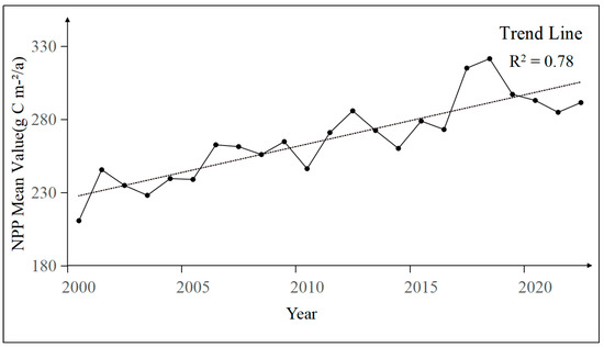 - From 2000 to 2023, vegetation NPP showed an overall fluctuating upward trend, with an average annual increase of 4.26 g C m−2 a−1 and a multi-year mean of 260.23 g C m−2 a−1. Spatially, NPP exhibited significant heterogeneity, with higher values being concentrated in the central region and lower values in the east and west. The proportion of low-NPP areas declined notably, while high-NPP areas increased significantly.