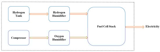 In the current study, the fuel cell module comprises four main components: a compressor, hydrogen storage tank, a humidifier, and a fuel cell stack, as illustrated in Figure 1. The compressor plays a critical role in supplying pressurized air (oxygen) to the system. Hydrogen is regulated by a control valve to achieve the desired flow rate. The humidifier adjusts the humidity levels of both hydrogen and oxygen streams before they enter the fuel cell stack, where the electrochemical reaction occurs. This reaction generates electricity as the final output.