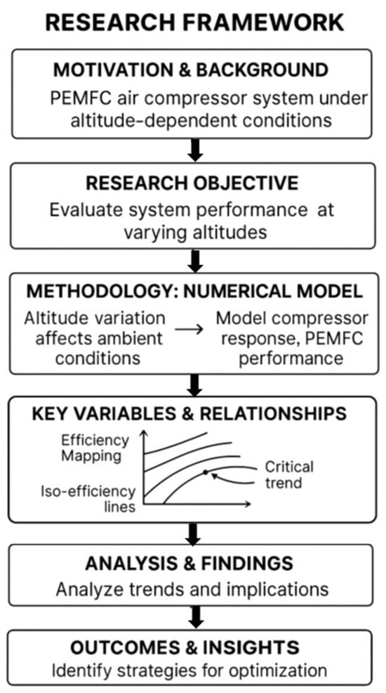 Figure 2 presents the methodological framework adopted in this study to evaluate the performance of a PEMFC air compressor system under altitude-dependent conditions. The framework begins with identifying the motivation and background, highlighting the environmental importance of fuel cells in aviation and the operational challenges imposed by high-altitude environments. The research objective is then defined as assessing system performance across varying altitudes. This is followed by the development of a numerical model that simulates how altitude variations affect ambient conditions, compressor behavior, and PEMFC performance. Key variables and relationships are then explored, with an emphasis on compressor efficiency mapping, iso-efficiency lines, and the identification of critical performance trends under altitude variation. These variables form the basis for an in-depth analysis and interpretation of system behavior. Finally, the framework results in generating insights and outcomes aimed at guiding optimization strategies and informing the design of more robust and altitude-resilient PEMFC systems for lightweight aircraft applications.