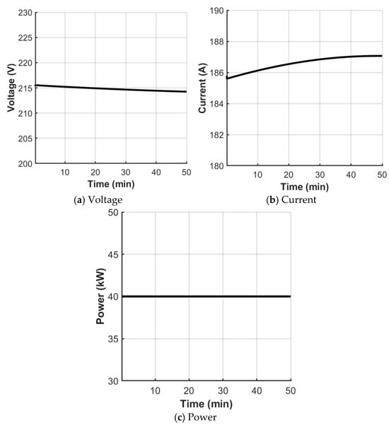 Figure 4 illustrates the time-dependent behavior of key fuel cell stack parameters, including voltage, current, and power. In Figure 4a, the voltage remains stable at approximately 215 V. In contrast, Figure 4b shows a slight increase in current demand, reaching approximately 187 A over the time interval. Consequently, based on the relationship , Figure 4c demonstrates that the fuel cell’s power output is around 40 kW.