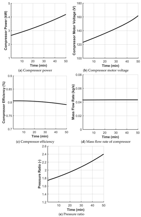 High-altitude conditions significantly impact both the fuel cell and compressor performance, as variations in altitude affect air pressure, temperature, and density. Figure 5 presents the compressor performance parameters, including power, voltage, efficiency, mass flow rate, compression ratio, and compressor map. Figure 5a illustrates the variations in compressor power over time. As altitude rises, compressor power demand rises, showing an increasing trend from 2.6 kW at sea level to 4.2 kW at 3000 m. This is primarily due to oxygen scarcity at higher altitudes, which forces the compressor to work harder to supply sufficient oxygen to the fuel cell cathode. Consequently, compressor power consumption increases, and, as shown in Figure 5b, the motor voltage rises from 123 V to 162V. Figure 5c depicts the compressor efficiency, which declines slightly with increasing altitude due to the reduced oxygen availability, leading to an increase in compressor work to provide the desired pressure at the cathode. Figure 5d,e illustrate the mass flow rate and pressure ratio of the compressor, respectively. According to Figure 5d, the mass flow rate remains constant due to a balance between air density and compressor speed. In other words, as altitude increases, air density decreases, and the compressor compensates by increasing its speed to maintain a constant mass flow rate over time. Figure 5e shows that the compression ratio follows an increasing trend. This is due to the reduction in ambient pressure at the compressor intake, which forces the compressor to operate at a higher pressure ratio to maintain performance.